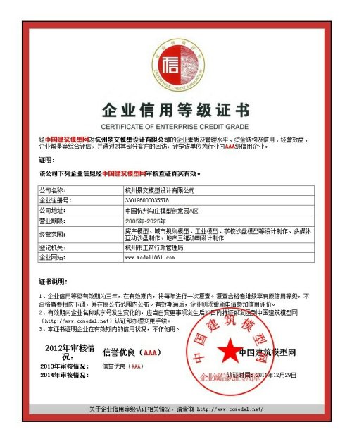 經(jīng)中國(guó)建筑模型網(wǎng)對(duì)杭州景文模型設(shè)計(jì)有限公司的企業(yè)素質(zhì)及管理水平、資金結(jié)構(gòu)及信用、經(jīng)營(yíng)效益、企業(yè)前景等綜合評(píng)估,并通過(guò)對(duì)其部分客戶(hù)的回訪,評(píng)定該單位為行業(yè)內(nèi)AAA級(jí)信用企業(yè)。